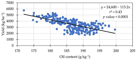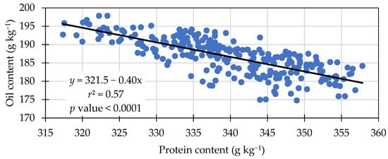 Seed oil concentration was significantly different among treatments. Treatment means ranged from 184.9 to 188.3 g kg−1 in seed oil content (Table 6). The treatments with 30 kg N ha−1 resulted in the greatest oil concentration (188.3 g kg−1), equal to the Azospirilum and 0 kg N ha−1. A negative linear relationship was observed between seed protein and oil content (Figure 2), an increase of 1 g kg−1 of protein content resulted in a decrease of approximately 0.4 g kg−1 in oil content. This negative relationship was also observed by others [37,40]. Another negative linear relationship was observed between oil content and grain yield (Figure 3). The linear equation in Figure 3 indicates yield was approximately 113 kg ha−1 lower for each 1 g kg−1 oil content increase.