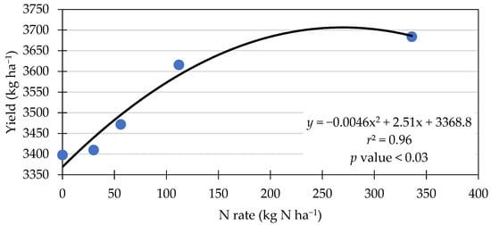 Figure 4 shows a significant polynomial relationship between the N rate and grain yield. The equation suggests that yield increased with the addition of N up to the rate of 273 kg ha−1, where the curve hits its highest point (3711 kg ha−1). These results of a polynomial relationship are similar to what was found in a corn response to the N rate study, suggesting that corn yield responded to N increments up to a point and then started to decline [44].