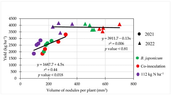 Linear relationship between volume of nodules and soybean grain yield at Fargo, ND, USA in 2021 and 2022.