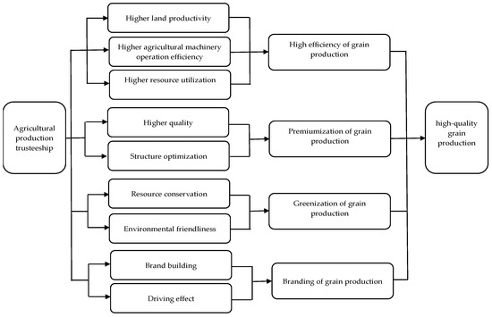 Agricultural production trusteeship refers to a mode of agricultural operation in which farm households and other management entities entrust all or part of the operational links in agricultural production to agricultural production service organizations for completion or assistance without transferring their land management rights [18]. This can effectively promote the quality, efficiency, and greenization of grain production. With regard to the improvement of quality and efficiency, researchers have found that agricultural production services can improve the efficiency of the use of resource factors by optimizing factor inputs and can thereby promote sustainable grain production [19]. Agricultural technology promotion services, agricultural information services, and agricultural product marketing services are conducive to improving the willingness and ability of farm households to produce and sell high-quality agricultural products [20,21]. Moreover, the production link outsourcing services help agricultural operators to have extra financial resources and energy to create brands for quality agricultural products [22,23]. With regard to green production, researchers have found that agricultural production services can contribute to the increase in green productivity in agriculture by motivating farm households to adopt green agricultural production techniques and to reduce the use of pesticides and chemical fertilizers [24,25]. At the same time, they can break through the restriction of farm households’ low willingness to choose green production and directly drive farm households who have been offered agricultural production services to practice green production.