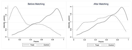 Ensuring matching quality requires a common support domain check [46]. As shown in Figure 2, the probability distribution of propensity scores of the farm households in the experimental group and those in the control group varies greatly before matching, with the experimental group concentrated in the higher value domain, while the control group is concentrated in the lower value domain. After matching, the difference in the probability distribution of propensity scores of the two groups of farm households is obviously reduced, and the common support domain is larger. Referring to the above data tables, 28 samples are lost in the experimental group and 80 samples are lost in the control group, with approximately 90.8% of the samples in the common support domain, so it is a good match.