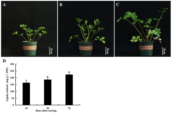 Morphological changes and lignin content of “Nanxuan Liuhe Ziqin” petioles during growth. (A) 30 d (seedling stage) after sowing; (B) 50 d (vigorous growth period) after sowing; (C) 70 d (commercial stage) after sowing; (D) Lignin content of celery during growth. Data are expressed as the means ± standard deviation (SD) of three replicates. Different lowercase letters indicate significant differences at 0.05 levels.