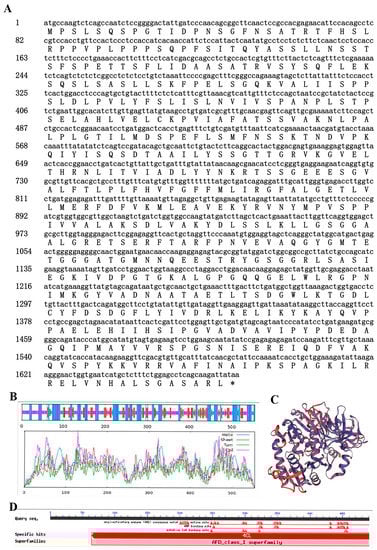 Bioinformatics analysis of Ag4CL3. (A) Nucleotide and encoded amino acid sequence of Ag4CL3 gene, *: Stop codon; (B) The secondary structure model of the Ag4CL3 protein; (C) The tertiary structure model of the Ag4CL3 protein; (D) Prediction of conserved functional domain of theAg4CL3 protein.