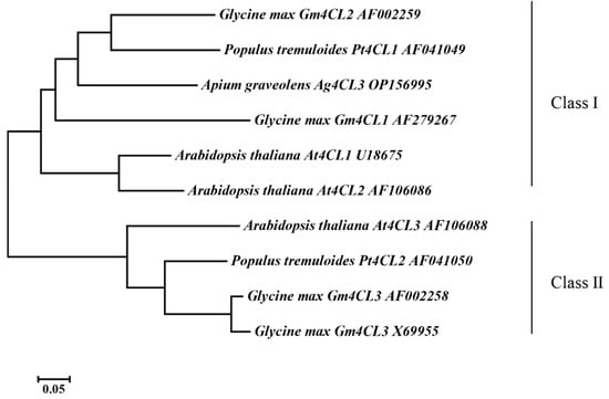 The Ag4CL3 gene cDNA sequence was successfully cloned from “Nanxuan Liuhe Ziqin” (GenBank OP156995) and contained an ORF length of 1668 bp, encoding 555 amino acids (Figure 2A). The theoretical isoelectric point was 6.89, and the protein molecular weight was 59.85 kDa. The secondary structure mainly consisted of 31.89% α-helixes, 18.02% extended strands, 6.67% β-turns, and 43.42% random coils (Figure 2B). The tertiary structure composition is consistent with its secondary structure composition (Figure 2C). The Ag4CL3 protein has a class-I superfamily of adenylate-forming domains. It has an active site, an AMP binding site, putative CoA binding site, and acyl-activating enzyme (AAE) conserved motif (Figure 2D). In order to investigate the phylogenetic relationships of 4CL proteins, a phylogenetic tree was constructed using the maximum likelihood method for a total of 10 amino acid sequences of 4CLs from A. thaliana, G. max, and P. tremuloides (Figure 3). The results showed that Ag4CL3 successfully clustered with At4CL1, At4CL2, Gm4CL1, Gm4CL2, and Pt4CL1, indicating that Ag4CL3 belonged to class I. Moreover, the functional studies of class I and class II genes in A. thaliana, G. max, and P. tremuloides showed that they were involved in lignin synthesis and flavonoid synthesis. Therefore, it is speculated that Ag4CL3 plays a pivotal role in lignin biosynthesis in the celery.