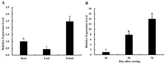 RT-qPCR was used to analyze the relative expression levels of the Ag4CL3 gene in the different tissues of “Nanxuan Liuhe Ziqin”. At 70 d after sowing, the Ag4CL3 gene was expressed in the roots, leaves, and petioles of “Nanxuan Liuhe Ziqin”, but the relative expression was significantly different. The relative expression of the Ag4CL3 gene was highest in petioles, second in roots, and lowest in leaves (Figure 4A). In the seedling stage (30 d after sowing), the growth period (50 d after sowing), and the commercial stage (70 d after sowing), the relative expression of the Ag4CL3 gene in the petioles showed remarkable differences. The highest relative expression of the Ag4CL3 gene occurred at the commercial stage (70 d after sowing) (Figure 4B).