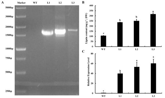 Identification of transgenic A. thaliana using (A) PCR amplification; (B) Comparison of lignin content between WT and transgenic A. thaliana lines (L1, L2, L3); (C) Ag4CL3 gene expressed in WT and transgenic A. thaliana lines (L1, L2, L3). Data are expressed as the means ± standard deviation (SD) of three replicates. Different lowercase letters indicate significant differences at 0.05 levels.