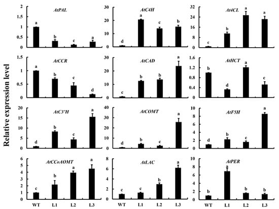 Expression profiles of lignin-related structural genes in A. thaliana plants. Data are expressed as the means ± standard deviation (SD) of three replicates. Different lowercase letters indicate significant differences at 0.05 levels.