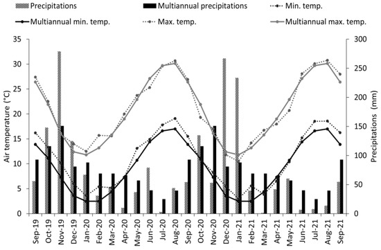 Warmer temperatures occurred during the autumn–winter of 2019–2020 and summer 2021 compared with the multiannual trend. The hottest temperatures in both years occurred in August, reaching almost 31 °C, and the coolest ones were registered in January with 3.6 °C in 2020 and 3.0 °C in 2021. Different distributions in precipitation compared to the multiannual average occurred in both years. In particular, a wetter November and December and a drier spring than the multiannual trend were recorded in 2019–2020. In 2020–2021, the season was mainly characterized by unusual rainfall in December and January and a particularly dry March. In 2020, precipitations were roughly double that of the multiannual average in early summer. A drier summer (June to September) compared to the multiannual trend and 2020 was encountered in 2021.