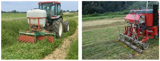 The experiment included eight treatments within two factors, cover crop species and tillage system. Treatments were arranged over plots following a randomized complete block design (RCBD) with three replicates. Plots measured 6 m × 10 m. Cover crop treatments consisted of monocultures of rye (S. cereale cv. Dukato), squarrose clover (T. squarrosum cv. OK), their mixture, and control kept with natural vegetation during winter. Cover crops and control plots were compared under two tillage systems (i) flail mowing and soil incorporation to almost 15 cm depth with a rotary tiller/cultivator in two passes as a standard conventional tillage system (CT) and (ii) rolling with two passes of a roller-crimper (Eco-Roll®, Clemens Technologies, Wittlich, Germany) followed by two flaming interventions (MAITO Srl., Arezzo, Italy, based on a prototype designed and realized at the University of Pisa) as a no-till (NT) system (Figure 2).