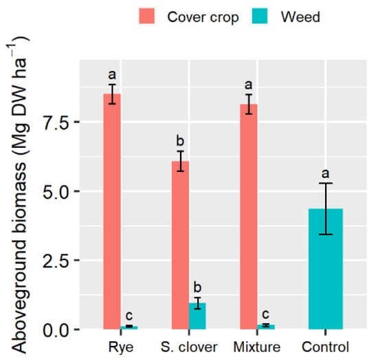 Cover crop and weed aboveground dry biomass at the time of cover crop termination. For each variable, bars with different letters are significantly different (p ≤ 0.05). S. clover: Squarrose clover. Error bars represent the standard errors of the estimated marginal means.