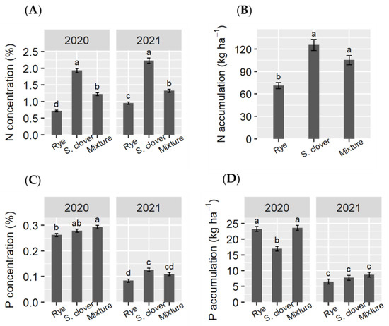 Similarly, cover crop N accumulation differed across cover crop species and years (with no significant interaction, as shown in Table S1) and was mainly influenced by cover crop tissue N concentration (Figure 4B). Across both years, squarrose clover and the mixture accumulated the highest amount of N, while rye had the least amount), with N accumulation varying between 71.21 and 125.60 kg ha−1. P concentration was drastically lower in 2021 in all the cover crops (on average, 0.28 vs. 0.11 in 2020 and 2021, respectively). The mixture in 2020 and the clover in 2021 had higher P concentration than rye, with differences accounting for up to +40% in 2021, as represented in Figure 4C. P accumulation in cover crops ranged from 16.99 to 23.63 kg ha−1 in 2020, with clover accumulating the least (but significantly compared to rye and the mixture only in 2020). In 2021, on average the cover crops accumulated around half the P accumulated in 2020, ranging from 7.78 to 8.75 kg ha−1, with no differences between the cover crops (Figure 4D).