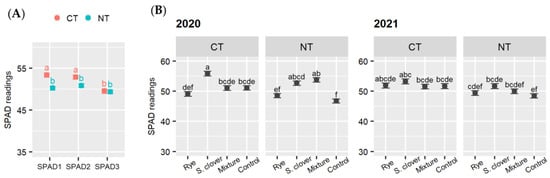 Variation in SPAD values during the growing season in response to the interactions of the tillage system and crop stages (A) and cover crop, tillage, and year (B). Points represent the emmeans, and bars represent their standard errors. Different letters indicate significant differences (p ≤ 0.05) in each interaction. S. clover: squarrose clover; CT: conventional tillage; NT: no-till; SPAD1: vegetative growth stage; SPAD2: flowering stage; SPAD3: fruit development stage.