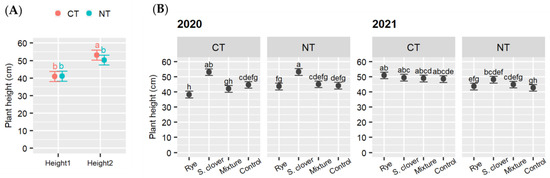 Variation in tomato plant height during the growing season in response to the interactions of tillage system and crop stage (A) and cover crop, tillage system and year (B). Points represent the emmeans, and bars represent their standard errors. Different letters indicate significant differences (p ≤ 0.05) in each interaction. S. clover: squarrose clover; CT: conventional tillage; NT: no-till; Height1: flowering stage; Height2: fruit development stage.