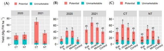 Concerning the interaction between tillage system and year (Figure 7A), a significant increase in the potential yield and a decrease in the unmarketable yield were observed for both CT and NT in 2021. However, differences between tillage systems for potential fresh yield were only observed in 2021 (Figure 7A). In 2021, the total fresh yield was 2.5 times greater than that in 2020. Compared to NT, double the total fresh yield was found in CT (69.73 vs. 34.46 t ha−1). Averaged over tillage systems, the interaction between cover crop and year was significant only for the potential yield and the total yield, showing clover and mixture producing around 2.7 times more of potential and total yield than rye and control in 2020 while being statistically like them in 2021 (Figure 7B). A significant interaction between cover crop and tillage system (Figure 7C) did not reveal statistically supported differences between cover crops despite the higher values in squarrose clover and mixture treatments in both tillage systems. In contrast, clover and mixture significantly incremented NT’s potential and unmarketable yields by almost 68% and 150%, averaged over both cover crops, compared to rye and control. respectively (Figure 7C). Differences between treatments were not statistically significant for the total fresh yield as well, despite a tendency for squarrose clover and mixture in CT and NT to have higher yields relative to all other treatments.