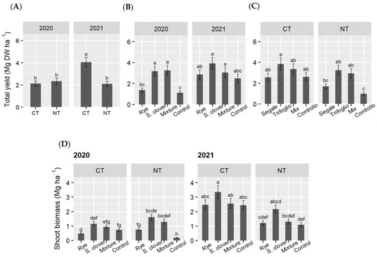 Interaction effects of tillage system and year (A), cover crop and year (B) and cover crop and tillage system (C) on dry tomato yield, and interaction effects of tillage system, cover crop and year (D) on tomato shoot biomass at harvest. Different letters indicate significant differences (p ≤ 0.05) in each interaction. S. clover: Squarrose clover; CT: conventional tillage; NT: no-till. Error bars represent the standard errors of the estimated marginal means.