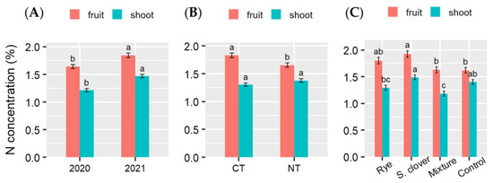 Main effects of tillage (A), cover crop (B), and year (C) on Nitrogen concentration (Nconc) in tomato shoots and fruits. For each variable, different letters indicate significant differences (p ≤ 0.05) in each main effect. S. clover: Squarrose clover; CT: conventional tillage; NT: no-till. Error bars represent the standard errors of the estimated marginal means.