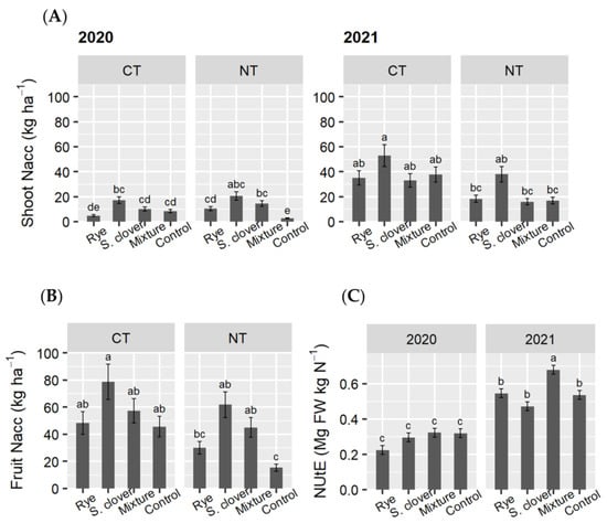 Interaction effects of cover crop, tillage, and year on Nitrogen concentration (Nconc) in tomato shoots (A), cover crop and year on Nitrogen accumulation (Nacc) in tomato fruits (B), and cover crop and year on Nitrogen utilization efficiency (NUtE) (C). Different letters indicate significant differences (p ≤ 0.05) in each interaction. S. clover: Squarrose clover; CT: conventional tillage; NT: no-till. Error bars represent the standard errors of the estimated marginal means.