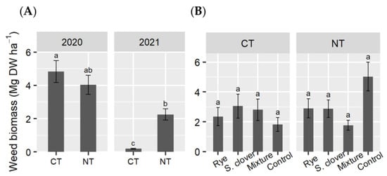 The response of weed biomass at harvest was influenced by the interaction of the tillage system and year, and cover crop and tillage system, as reported in Table S3 in the Supplementary Material. Weed infestation in CT, averaged over the cover crops, was around 25 times greater in the first year than in the second year, whereas it seemed similar between NT over the years (Figure 11A). The effect of the tillage system on weed biomass was observed only in 2021 with a consistent decrease of almost 92% relative to CT (Figure 11A). Despite the significant effect obtained by the generalized linear model for the interaction between cover crop and the tillage system, the post hoc test returned no significant differences between treatments (Figure 11B). However, it seems that when averaged over the years, the weed-suppressing effect of cover crops tended to be more significant in NT, with the mixture probably reducing weed biomass compared to the control (−65%) (Figure 11B).