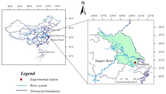 The study area was located at the Kunshan Experimental Station of the State Key Laboratory of Hydrology-Water Resources and Hydraulic Engineering of Hohai University (34°15′21″ N, 121°05′22″ E) during 2020~2021 (Figure 1). This area belongs to the subtropical monsoon climate zone in southeast China. The local way of farming was to practice rice–wheat rotation. The soil type was yellow-dark-yellow hydromorphic. The soil organic matter was 21.71 g/kg, total nitrogen 1.79 g/kg, total phosphorus 1.4 g/kg, total potassium 20.86 g/kg, pH value 7.4 in the 0–18 cm layer, and the bulk density of 0–30 cm soil was 1.32 g·cm−1 [5].