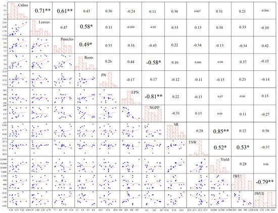 There were interrelated correlations among yield indexes (Figure 3). A correlation analysis was performed among culms, leaves, panicles, roots, PN, EPN, NGPP, SR, TSW, yield, IWU, and IWUE. The yield had a positive correlation with SR and TSW (0.85** and 0.52*), because the SR of rice is an important component of yield and improving the SR can directly increase the number of grains per ear, causing an increase in the yield of rice. NGPP had a negative correlation with EPN and dry matter of roots (−0.81** and −0.58*) during the harvest stage. IWU had a positive correlation with TSW (0.53*) and a negative correlation with IWUE (−0.79**).