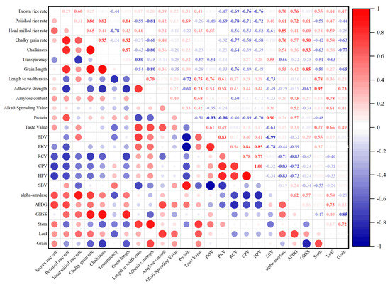 Correlation analysis of rice quality indexes, including brown rice rate, polished rice rate, head milled rice rate, chalky grain rate, chalkiness, transparency, grain length, length-to-width ratio, adhesive strength, amylose content, alkali spreading value, protein, taste value, BDV, PKV, RCV, CPV, HPV, SBV, alpha-amylase, APDG, GBSS, soluble sugar accumulation (stem, leaf, grain).