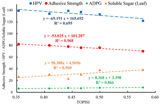 Relationships between the relative indicators and the comprehensive rice quality scores evaluated by TOPISIS. Hot paste viscosity (HPV), ADP-glucose pyrophosphorylase (ADPG).