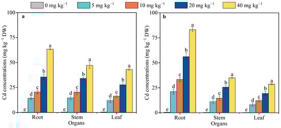 Cd concentration of E. pectinatus (a) and G. jasminoides (b) under different Cd treatments. Different letters in the same organs indicate the significant differences among treatments at p < 0.05. Cd, cadmium; DW, and dry weight.