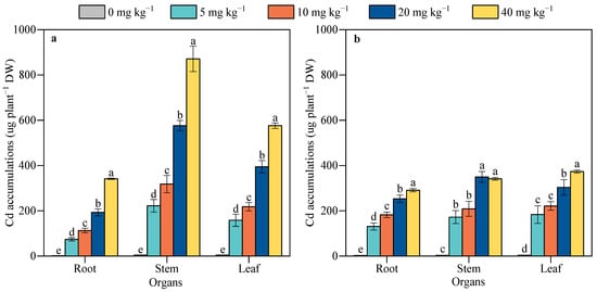 Increasing levels of Cd in the soil increased the concentrations of Cd in the different plant organs, and the concentrations of Cd in the plants reached their maximum levels following treatment with 40 mg kg−1 Cd (Figure 1a,b). The concentrations of Cd in the stems and leaves of E. pectinatus were higher than those of G. jasminoides at the same levels of Cd. However, the concentrations of Cd were higher in the roots of G. jasminoides than in those of E. pectinatus.