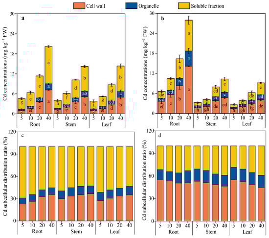Subcellular distribution of Cd and its proportion in the root, stem, and leaf of E. pectinatus (a,c) and G. jasminoides (b,d) exposed to Cd. Different letters in the same subcellular fraction indicate significant differences among the treatments at p < 0.05. Cd, cadmium; FW, and fresh weight.