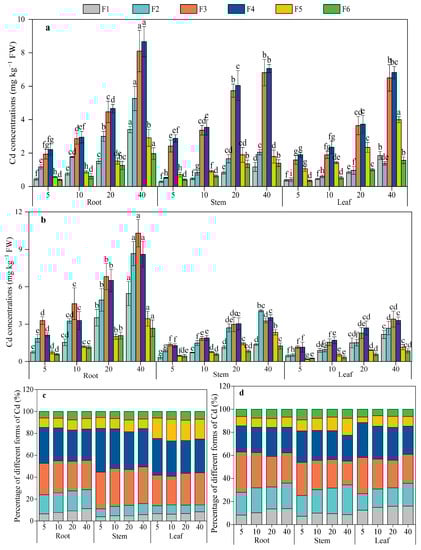 Different chemical forms of Cd and its proportion in root, stem, and leaf of E. pectinatus (a,c) and G. jasminoides (b,d) exposed to Cd. Different letters in the same chemical form indicate significant differences among the treatments at p < 0.05. Cd, cadmium; F1, inorganic Cd; F2, water-soluble Cd; F3, Cd bound to pectate and proteins; F4, insoluble phosphate Cd complex; F5, oxalate Cd; F6, Cd precipitate; FW and fresh weight.