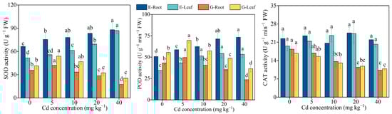 Antioxidant enzyme activities of E. pectinatus and G. jasminoides under a concentration gradient stress of Cd. Different letters indicate significant differences (p < 0.05) among different treatments. FW, fresh weight; SOD, superoxide dismutase; POD, peroxidase; CAT, catalase; Cd, cadmium; E, E. pectinatus; G, G. jasminoides.