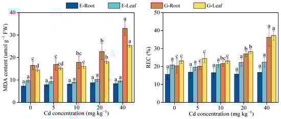 MDA and REC in roots and leaves of E. pectinatus and G. jasminoides. Different letters indicate significant differences (p < 0.05) among the different treatments. Cd, cadmium; FW, fresh weight; E, E. pectinatus; G, G. jasminoides; MDA, malondialdehyde; REC, relative electrical conductivity.