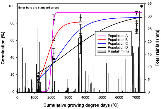 - Owen, M.J.; Michael, P.J.; Renton, M.; Steadman, K.J.; Powles, S.B. Towards large-scale prediction of Lolium rigidum emergence. I. Can climate be used to predict dormancy parameters? Weed Res. 2010, 51, 123–132. [Google Scholar] [CrossRef]