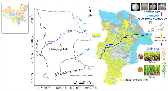 More and more studies have proven that with the reduction of chemical fertilizer usage, high yields can also be obtained [30]. The Yellow River Delta is not only a big crop production base, but also an important ecological shelter. Thus, the reduction of chemical fertilizer usage in the vast area of the Yellow River Delta plays huge direct and indirect functions in agricultural development. Based on the above analysis, the aim of this study is to summarize the chemical fertilizer usage information from the last 10 years and then analyze the potential for its reduced application. We hope that the research can supply scientific guidance for the rational utilization of fertilizer in the typical Yellow River irrigated area.