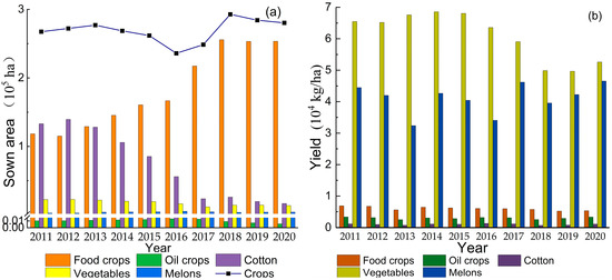 The total crop sown area maintained a stable level, and the food crops account for 41~87% of the sown area (Figure 2a). The sown area of food crops increased year after year. The sown area of oil crops and melons increased for the first two years and decreased during the following years. The downward trend existed for the cotton and vegetables among the investigated years. Contrary to the trend of the crop sown area, the grain yield per unit area decreased every year from 2011 (Figure 2b). The grain yield per unit area in 2020 was 23% less than that of 2011. The per unit area yield of oil crop, cotton, and melon showed no obvious change from 2011 to 2020. But the vegetable yield per unit area increased to its highest level in 2014, with a yield of 6.85 t/ha, then decreased until 2020.