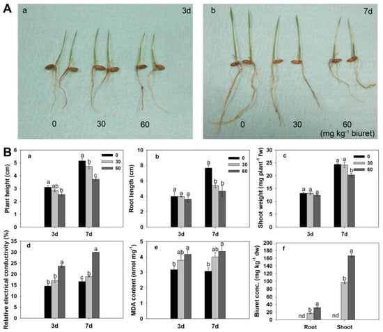 Effect of biuret toxicity on the growth of rice seedlings. (A) Phenotypic characteristics of rice seedlings under CK (a) and biuret treatment (b); (B) plant height (a), root length (b), shoot weight (c), relative electrical conductivity (d), MDA content (e), and biuret concentration (f) of rice seedling. Values are means ± SE (three independent biological replicates). Ten seedlings were combined for a representative sample. Different letters above the bars designate significant differences at p < 0.05.