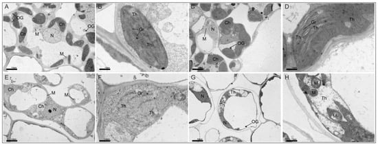 The chloroplast ultrastructures in rice seedling leaves exposed to biuret stress. (A,B) Chloroplast ultrastructure under non-biuret stress for 3 days, (C,D) chloroplast ultrastructure under non-biuret stress for 7 days, (E,F) chloroplast ultrastructures under biuret stress for 3 days, (G,H) chloroplast ultrastructures under biuret stress for 7 days. Bar = 5 μm in (A,C,E,G); bar = 1 μm in (B,D,F,H). Ch: chloroplast, M: mitochondria, Th: thylakoid grana, Gr: grana, OG: osmium granule.