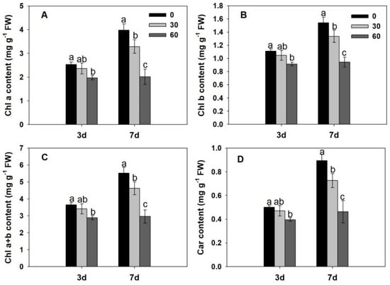 Biuret treatment significantly reduced the chlorophyll content in rice seedlings. When the rice seedlings were treated with 30 and 60 mg kg−1 of biuret, the contents of Chl a, Chl b, total Chl, and carotenoids decreased by 6.7%, 5.9%, 6.5%, and 6.0%, and by 22.3%, 17.7%, 20.9%, and 21.0%, on the 3rd day, respectively. When the rice seedlings were treated with 30 and 60 mg kg−1 of biuret, the contents of Chl a, Chl b, total Chl, and carotenoids significantly decreased by 17.3%, 13.2%, 16.2%, and 18.8%, and by 49.3%, 38.6%, 46.3%, and 48.1%, on the 7th day, respectively (Figure 3).