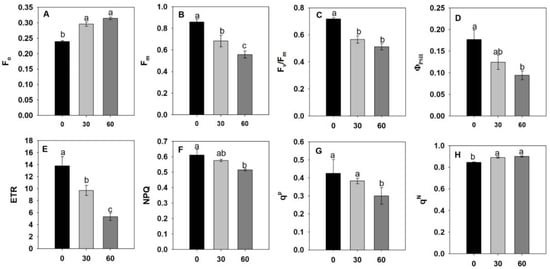 Changes in fluorescence parameters of rice seedlings exposed to biuret stress for 7 days F0 (A), Fm (B), Fv/Fm (C), ΦPSII (D), ETR (E), NPQ (F), qP(G) and qN (H). Values are means ± SE (three independent biological replicates). Different letters above the bars designate significant differences at p < 0.05.
