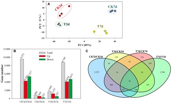 Principal component (PC) analysis and differentially expressed genes (DEGs) in the seedling leaves exposed to biuret stress. (A) The sample distribution in leaves according to PC1 and PC2. The percentage of variance is labeled for each component. (B) Numbers of DEGs in the seedlings under biuret treatment. (C) Venn diagrams for DEGS in the four comparison groups. CK3d, T3d, CK7d, and T7d represent the rice seedlings treated with 0 or 60 mg kg−1 of biuret for 3 or 7 days, respectively.