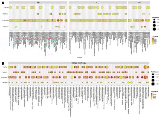 The enriched GO terms and KEGG enrichment analysis for the DEGs. (A) Important GO terms of DEGs with down-regulated expression in biuret treated seedlings compared with CK. BP, biological process; CC, cellular component; MF, molecular function. (B) Important KEGG pathways of DEGs with down-regulated expression in biuret treated seedlings compared with CK. CK3d, T3d, CK7d, and T7d represent the rice seedlings treated with 0 or 60 mg kg−1 of biuret for 3 or 7 days, respectively.