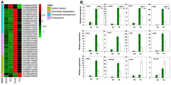 Taking into account the physiological data, GO terms (Figure 6A), and KEGG pathways (Figure 6B) of the transcriptome data, this study focused on the DEGs involved in chloroplast formation. A total of 34 identified DEGs were further divided into four main classes: 33 DEGs with significantly lower expression levels, namely, 13 chloroplast development, 11 photosystem, and 9 carbon fixation DEGs, and 2 DEGs related to chloroplast degradation with significantly higher expression levels in T7d than in CK7d (Figure 7A and Table S2).
