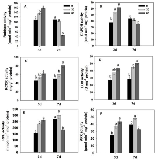 Rubisco activity was markedly stimulated when exposed to biuret on the 3rd day, and the activity of Rubisco was promoted by 23.8% and 43.7% with the increase in the biuret concentration, while the Rubisco activity was markedly decreased by 7.3% and 59.0% when exposed to biuret on the 7th day (Figure 8A). Correspondingly, the activities of GAPDH and RPE were significantly increased by 64.4% and 65.0% compared with the control on the 3rd day, while the activities of GAPDH and RPE were significantly lowered by 21.4% and 32.8% on the 7th day, respectively, when the rice seedlings were treated with 60 mg kg−1 of biuret (Figure 8B,E). Compared with the control, the activities of RCCR and LOX in the leaves were significantly increased by 20.0% and 62.1%, and by 57.7% and 77.2%, on the 7th day when the rice seedlings were treated with 30 and 60 mg kg−1 of biuret, respectively (Figure 8C,D). These findings show that the APX activity in rice leaves was decreased by 17.7% with the application of 60 mg kg−1 of biuret on the 7th day (Figure 8F).