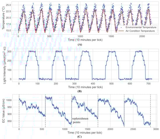 Changes in collected environmental variables data. (A) Environmental temperature and air condition controlled temperature; (B) LED light intensity; (C) EC value of nutrient solution.