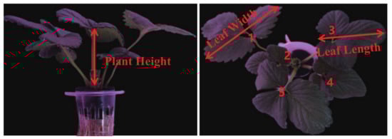 Plant Height, Leaf Size and Count of Leaf: Plant height information is not only a good measure of strawberry growth status, but also easy to measure. A vernier caliper was used to measure the portion above the root to the highest petiole as plant height information. In addition, the size of the leaf and the count of leaves determine the photosynthetic rate of the strawberry plant, which directly determines new bud differentiation and fruit yield. However, strawberry leaves are terately compound [46] and irregularly shaped, so the total length and width of each compound leaf was used as the data for consideration. These data were collected every 3 to 5 days; and data definitions are shown in Figure 3.