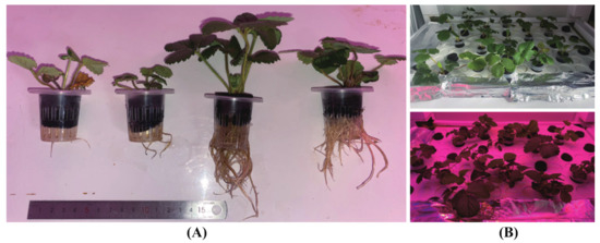Strawberry samples from different groups and the growing conditions are shown in Figure 4. Figure 4A shows randomly selected strawberry samples from different groups taken on the 7th day after transplanting. Figure 4B shows how the strawberries were grown with the LED off and on, respectively.