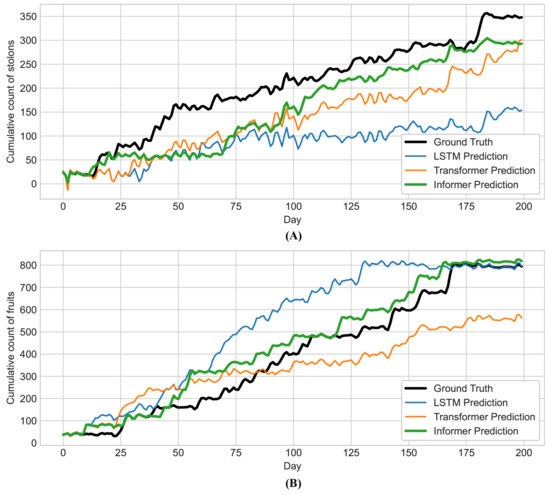 Prediction results of LSTM, Transformer and Informer. (A) Prediction results of four prediction models for stolons; (B) Prediction results of four prediction models for fruits.