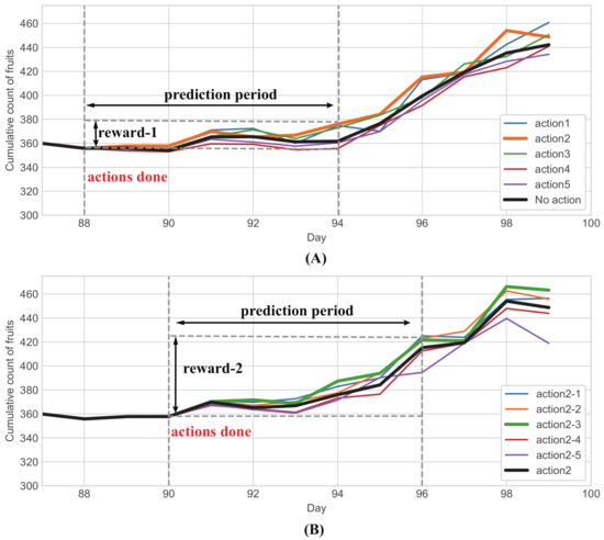 It should be noted that in the experiments, the minimum variation scale was 1 °C of temperature, 10 of light intensity, and 50 of EC value. After Q-learning made each action, Informer would predict how much the count of stolons/fruits would increase in the next several days if the action was performed, and took the predicted result as rewards. Figure 9 shows that in the task of obtaining the maximum count of fruits, Q-learning made five actions. The strategy with the most fruit increase was used as the final execution strategy: in Figure 9A, action 2 was selected as the final strategy on day 88, with its reward of a 24 increase on day 94; in Figure 9B, based on action 2, action 2–3 was selected as the final strategy on day 90, and the reward was 64 of increase. Moreover, actions in these two policies are indicated in Table 5: