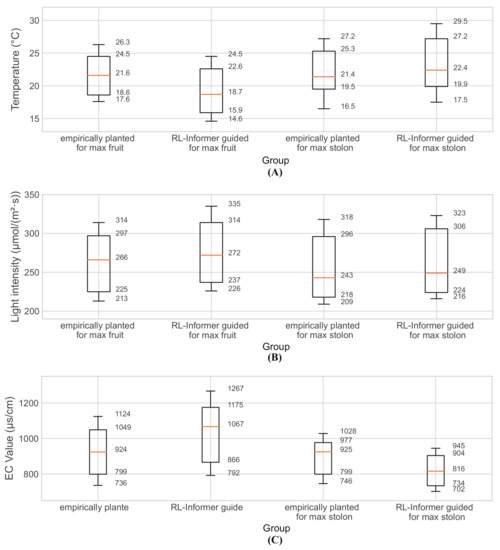 In the experiment designed to obtain the maximum count of fruits, the median temperature suggested by RL-Informer was 18.7 °C, lower than the empirically planted group temperature (21.6 °C), and lower overall. Refs. [54,55] also proved the promotion of strawberry fruiting by a relatively lower temperature. The maximum light intensity of 335 and the upper quartile of 314 were also significantly higher than those of the empirically planted group, but the median of 272 was close to that of the empirically planted group; this was caused by the lower light intensity suggested by RL-Informer during the dormant state [56,57] of strawberry after each flowering and fruiting period. During the dormant period, the strawberry plants mainly engage nutrient accumulation and leaf growth, and the appropriate reduction of light intensity during this period can maintain the vegetative propagation of strawberry while saving electricity. For the EC value of nutrient solution, RL-Informer gave a significantly higher result (1067 ) than the empirically planted group (924 ) for the whole period. While, in the experiment designed to obtain the maximum count of stolons, RL-Informer recommended higher environmental temperatures (maximum 29.5 °C, median 22.4 °C), and lower EC values (maximum 945 , median 816 ) for the nutrient solution; while there were still no significant modifications for light intensity. Ref. [58] has studied the lower concentration of nutrient solution was more beneficial to the occurrence of daughter plants of strawberry, which is consistent with the results output by the proposed model.