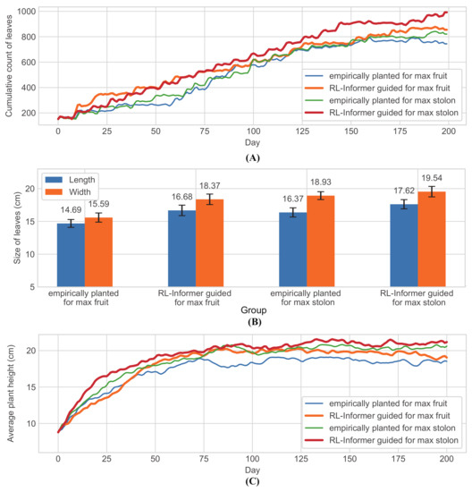 The two experiments guided by the RL-Informer model increased the total count of leaves by 14.6% and 22.02%; the average maximum leaf size by 29.78% and 11.10%; and the average plant height by 4.68% and 5.17% compared to the control groups. It could provide more nutrient accumulation for the stolon growth and fruiting. As a result, the cumulative count of stolons and fruits in four experimental groups are showed in Figure 12.